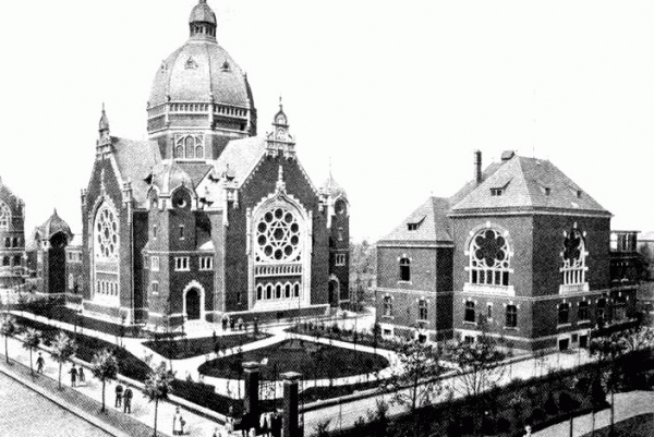 Komentarz:Wielka Synagoga w Katowicach (widok od strony August-Schneider-Strasse - obecnie ul. Mickiewicza, a dokładniej z okolic dzisiejszego Baru Mlecznego Europa). Budynek z prawej strony to kiedyś zabudowania administracyjne synagogi, dziś Miejska Przychodnia Specjalistyczna.
