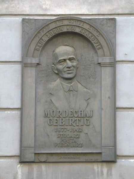 Tablica pamiątkowa poświęcona Mordechajowi Gebirtigowi מרדכי געבירטיג na murze kamienicy, w której mieszkał.